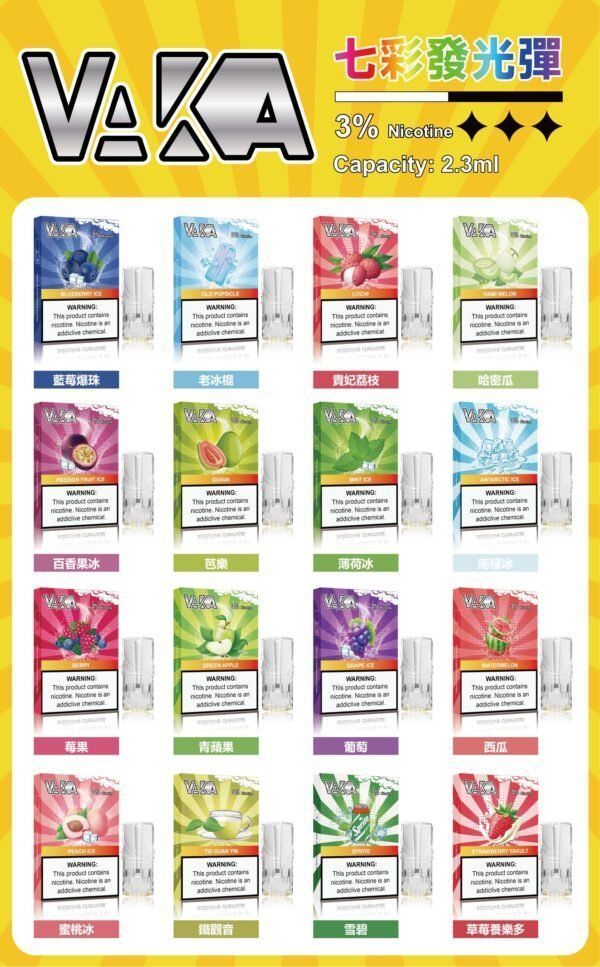 VAKA煙彈 專為悅刻一代/SP2S主機設計的升級版煙彈,內置七彩LED燈效,吸食時自動變換氛圍光,同時保留原廠級口感與防漏油技術。產品描述 VAKA煙彈是一種設計時尚且具有視覺效果的電子煙產品。 產品特點 七彩發光:煙彈在使用時會發出七彩燈光,增加了視覺上的享受。 便攜設計:小巧輕便,方便攜帶。 多種口味:提供多種口味選擇,滿足不同口味偏好的用戶。 即用即拋:大多數 VAKA 七彩發光煙彈是一次性使用的,無需充電或更換煙彈。 長效電池:內置的電池可以支持長時間使用。 使用方法 拆封:打開包裝,取出煙彈。 吸煙:直接吸煙即可啟動,煙彈會自動發光。 棄置:使用完畢後,將煙彈妥善丟棄。 注意事項 適度使用:避免過度使用,注意控制吸煙頻率。 安全存放:將煙彈存放在乾燥、陰涼的地方,遠離高溫和陽光直射。 未成年人禁用:本產品僅限成年人使用,未成年人禁止使用。 健康風險:吸電子煙仍可能對健康有影響,請謹慎使用。 優點 視覺效果佳,使用體驗更佳 便於攜帶,適合隨時使用 多種口味選擇,滿足不同需求 喜歡vaka的還可以購買Vaka一代主機哦!
